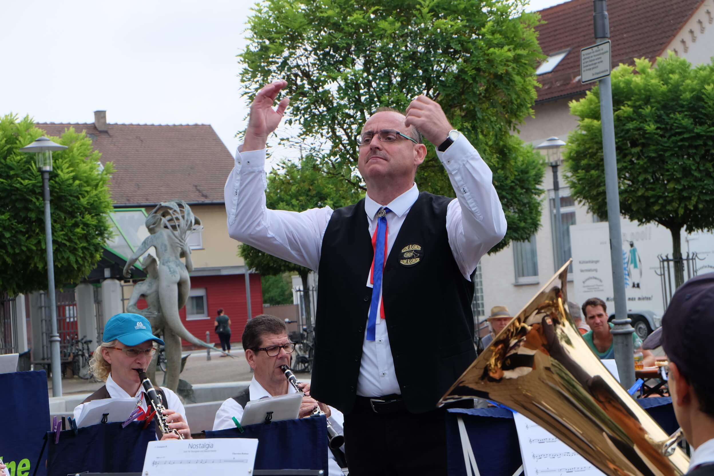 Am letzten Wochenende vor den großen Ferien hat der Musikverein nochmals zur Sonntags-Matinee auf dem Rathausplatz eingeladen. Zahlreiche treue Anhänger traditioneller Blasmusik sind der Einladung gefolgt um zusammen mit der „Kleinen Blasmusik“ das 15 jährige Bestehen dieser Formation zu feiern. Neben zahlreichen internationalen Musikpreisen zeichnet sich die Formation vor allem auch durch großartige Solisten aus. So brillierte Manfred Hildebrand an der Es-Klarinette mit einem, speziell für ihn geschriebenem Solo „Es-Kapaden“. In „Brüderchen und Schwesterchen“, ebenfalls eine Auftragskomposition, überzeugten Maurice Elsässer am Flügelhorn und Stefan Franz am Bariton. Das Stück wurde, ebenso wie viele weitere Werke der „Kleinen Blasmusik“ vom Dirigenten Thorsten Reinau geschrieben anlässlich des Geburtstags von Gernot Franz, ehemaliger Dirigent des Musikverein „Harmonie“. In der Uraufführung wurde es von seinen beiden Kindern Regina und Stefan gespielt.