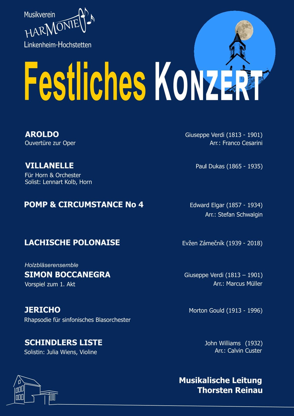 Unter der bewährten Leitung von Thorsten Reinau präsentierte sich das Orchester in ausgesprochen guter Spiellaune und so sprang der Funke der Begeisterung auch schnell aufs Publikum über. Wieder einmal schaffte es unser Dirigent, durch eine stimmige Auswahl an Werken aus Oper, Film und sinfonischer Blasmusik einen begeisternden Konzertabend in glanzvoller Kulissen zu gestalten. Von kraftvollen Klängen und dynamischen Kontrasten der Ouvertüre zur Oper "Aroldo" von Giuseppe Verdi bis hin zum Abschluss des Konzertes mit dem Thema aus "Schindlers Liste" von John Williams.